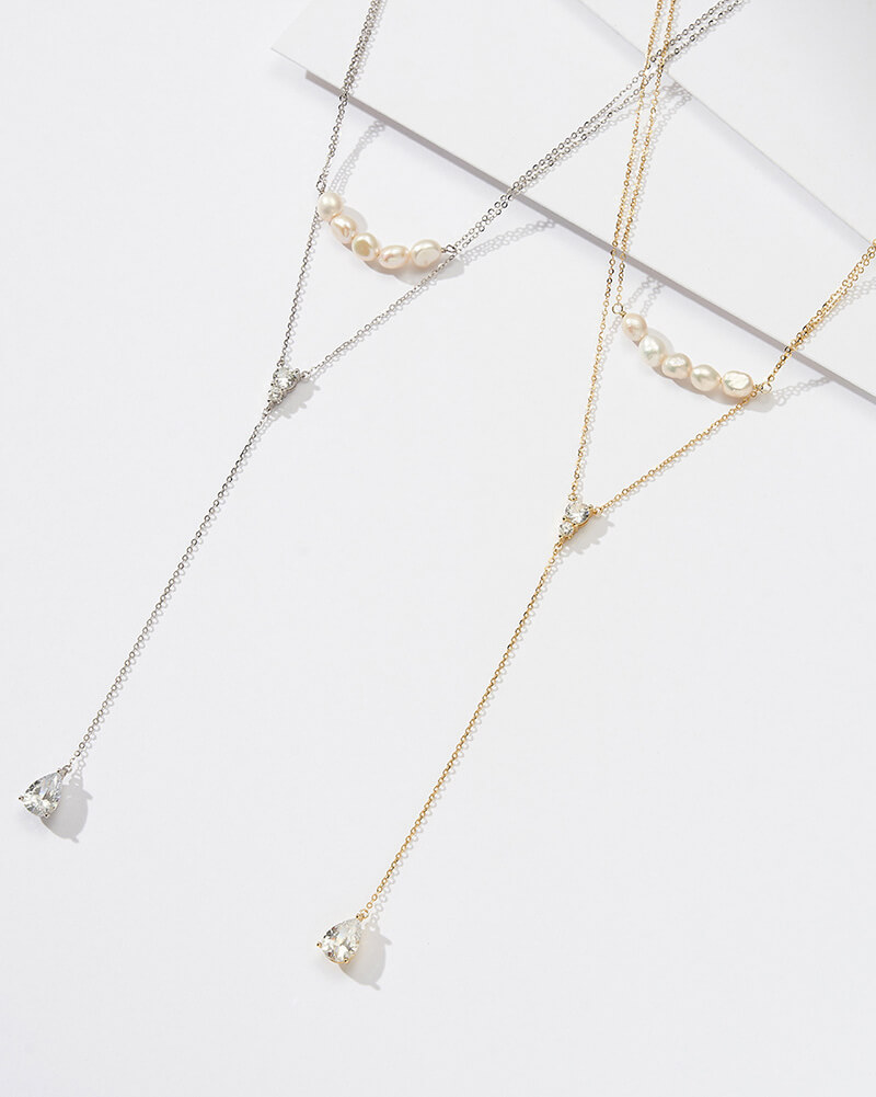 14K Gold Y Necklace S925 CZ Diamond Drop Pearl Necklace For Daily