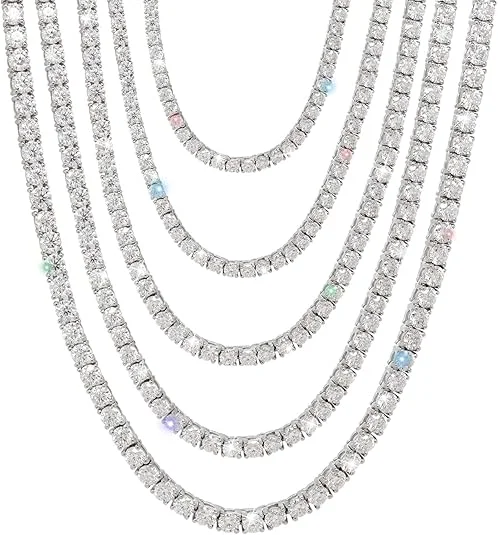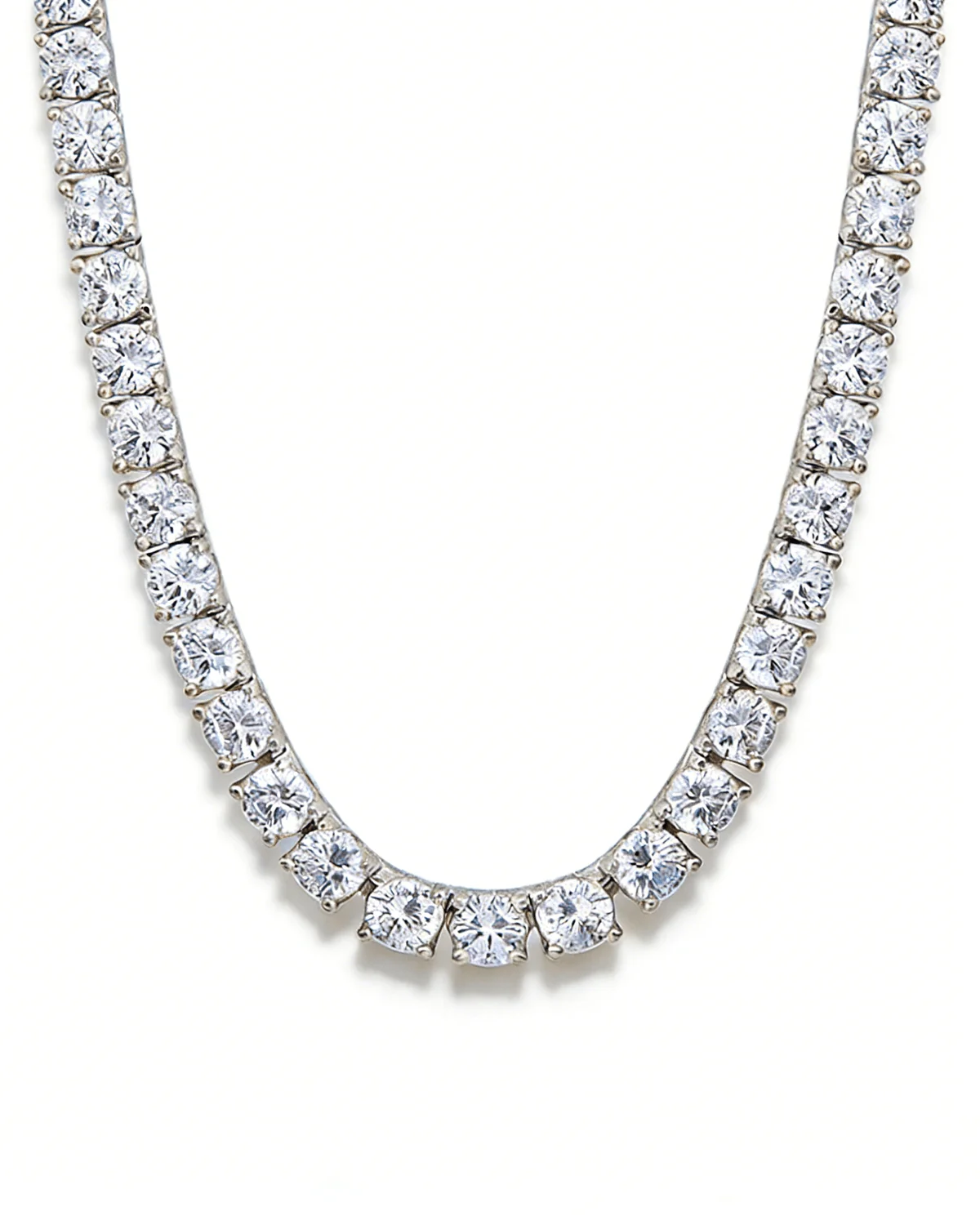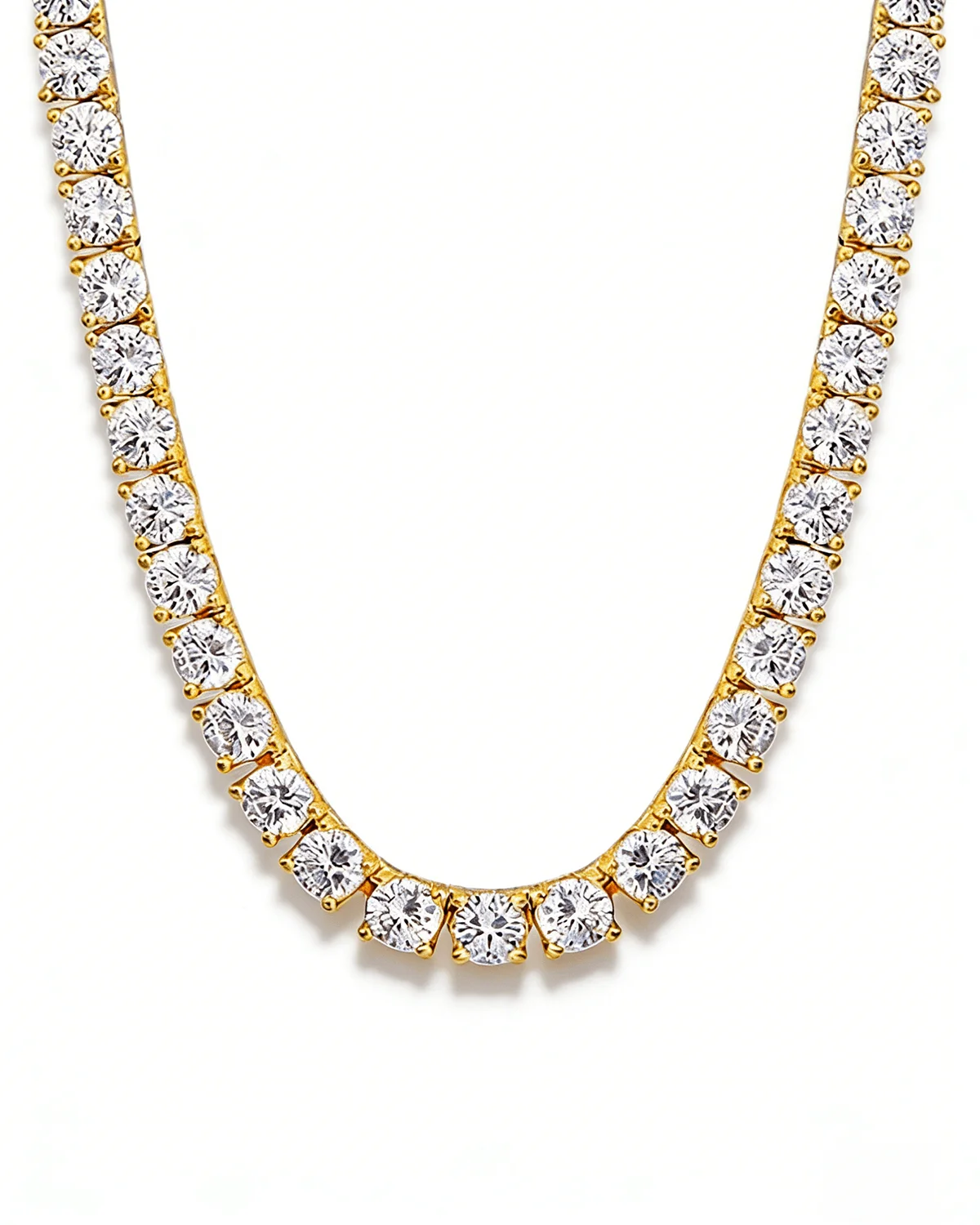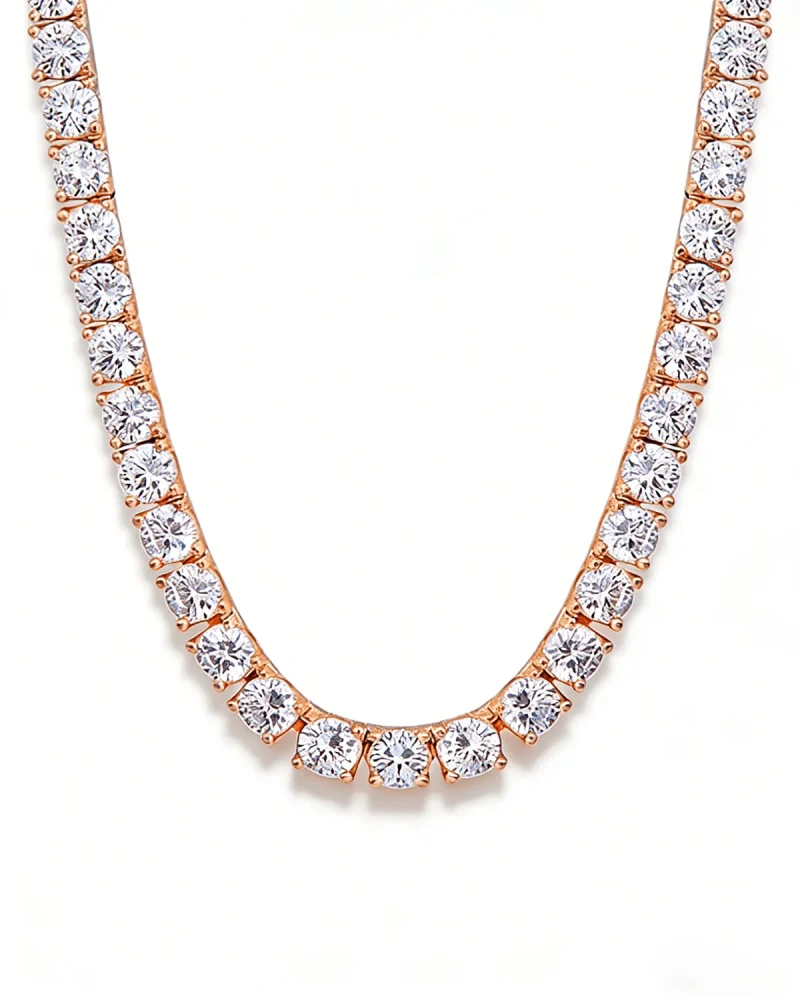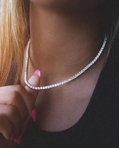 Our diamond tennis necklace chain features handpicked, premium lab-grown moissanite with VVS1 clarity—so clear and sparkly. The setting is crafted from solid gold with a prong setting, meaning no green skin, no fading, and a brilliant, permanent shine.