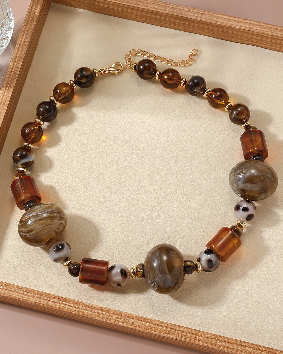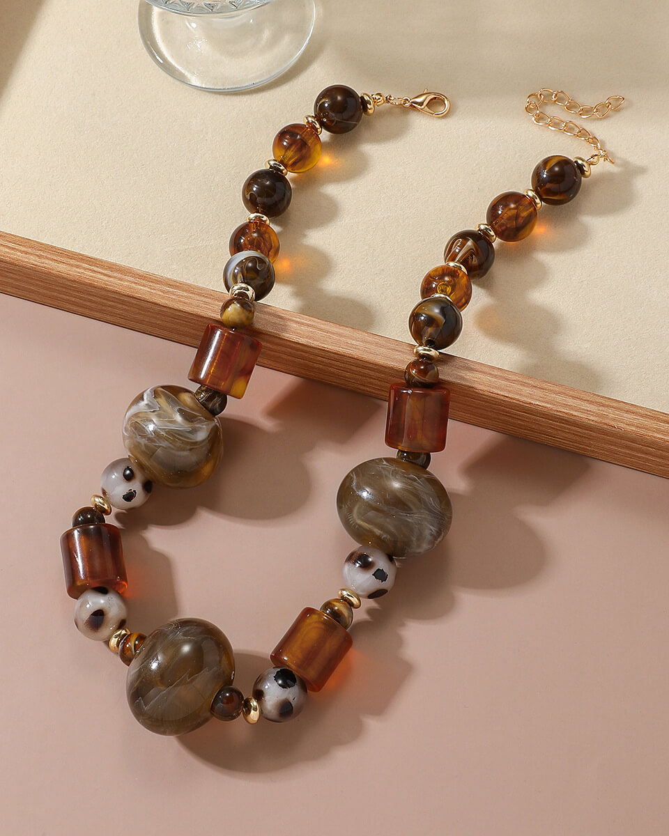 Crafted with artful splicing of warm, earthy tones, this necklace flaunts irregular, exaggerated geometric shapes that demand attention. It’s a true statement piece for trend-forward women who love to turn heads and own their unique style.